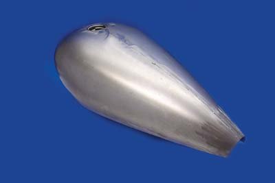 Gas tank accepts a left side petcock and has a fuel capacity of 2.5 gallons. It includes hidden mount strap mounting, and a screw type center bung. The tank requires sanding and primer. Check the tank for flaws and fit before painting. Do not grind or sand the seams or joints. Check the petcock opening, making sure the petcock can be easily installed. The petcock fitting should be masked or plugged during painting for easy installation of the petcock. Clean the inside of the tank. It is suggested to pressure test and use a tank sealer. We suggest using Kreem gas tank combo kit to clean, condition and seal to help stop leaks and prevent corrosion. Fits:Custom application UOM: 1 - EA Style: Image 2011 Catalog pages: 1186 Measurements Top Length: 21" Bottom Length: 23" Rear Width: 2.5" Front Width: 11.5" Rear Height: 2.5" Front Height: 8" Front Tunnel Height: 3" Rear Tunnel Height: 1.5" Tunnel Length: 22.5" Suggested to use #41-0113 Kreem gas tank combo kit SAV for Harley Davidson Motorcycles