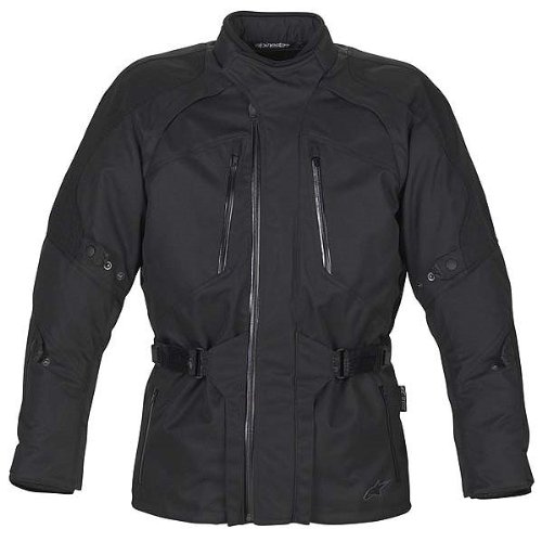 Touring jacket that is 100% waterproof 600-denier polyester fabric with PU coating construction Alpinestars exclusive waterproof, breathable Drystar internal lining Ballistic nylon-reinforced panels in elbows and shoulders Removable CE-certified soft elbow and shoulder protectors Raglan shoulder-cut construction Front center dual-flap closure system ensures a waterproof seal Waist adjustment with hook-and-loop straps for a custom fit Waist connection zipper allows attachment to select Alpinestars textile and leather pants Chest pad compartment with PE padding (Bionic Chest Guard available separately) Back protector compartment with PE padding (CE-certified RC back protector available separately) Reflective piping for nighttime visibility Two-way YKK Semi Auto Lock zippers in the wrists to aid ventilation YKK waterproof main front zipper is covered with a flap to increase protection against the elements Zip-operated ventilation on upper back Expansion gussets on front waist to improve comfort when in the riding position Removable full-sleeve thermal liner TPR details with high-frequency embroidered logos 2010 Model