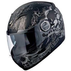 The Scorpion EXO-500 Skull Motorcycle helmet has a quiet, aero-tuned design for wind-tunnel tested comfort. The SpeedView internal retractable light smoke sun visor eases eye strain instantly in varying light conditions without changing face shields, plus it has an EverClear coating on both sides makes the Scorpion EXO-500 Skull a great choice for a fog free ride. The Scorpion EXO-500 Skull Motorcycle helmet has a great ventilation system: front and rear vents with aero-tuned rear spoiler, create vacuum and maximize airflow through the helmet. Polycarbonate Composite Shell. EverClear no-fog face shield. Breath-deflector: Enhanced fog-free performance. AirFit permits a rider to personalize helmet fit through air adjustable cheek pads. SpeedShift quick-change shield system: Easy, secure tool-less face shield changes in ten seconds or less. KwikWick moisture-wicking helmet liner and cheek pads: Breathable, easily removable and washable. ECE and DOT certified. For proper fit and size measure the circumference of your head 1" above your eyebrows and around the largest portion of the back of your head. 22 7/16" - 22 13/16" ----Medium 23 1/8" - 23 5/8" -------Large 24" - 24 3/8" -----------X-Large 24 13/16" - 25 3/16" ----XX-Large 25 9/16" - 26" ----------XXX-Large