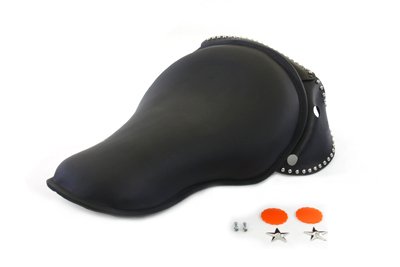 Black leather buddy seat comes with a three piece leather skirt with orange rosettes. Skirt has two holes on each side which will accept handle set. Steel formed baseplate with rib design is as original and accepts "T" bar mount systems. Mounting holes for the rail and seat mount are 3/8" - 24 UNF internal thread. Order mount hardware separately. Fits:EL 1936-1940FL 1941-1984WL 1929-1952UL 1937-1948 UOM: 1 - EA Color: Black 2011 Catalog pages: 1210 Measurements Length: 23" Front Width: 8" Rear Width: 16" SAV for Harley Davidson Motorcycles