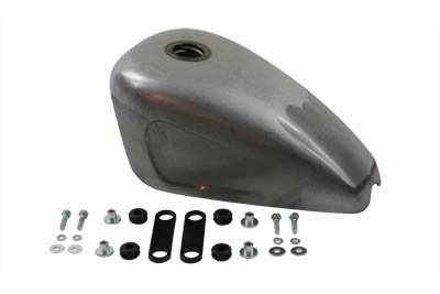 Gas tank has a left side petcock opening, and a fuel capacity of 2.4 gallons. It features a four bolt mount strap system to be welded onto the frame, indented sides, and a screw type bung. Order cap separately. The tank requires sanding and primer. Check the tank for flaws and fit prior to painting. Do not grind or sand the seams or joints. Check the petcock opening, making sure the petcock can be easily installed. The petcock fitting should be masked or plugged during painting for easy installation of the petcock. Clean the inside of the tank. It is suggested to pressure test and use a tank sealer. We suggest using Kreem gas tank combo kit to clean, condition, and seal to help stop leaks and prevent corrosion. Fits:Custom application UOM: 1 - EA Style: Chopper 2011 Catalog pages: 1187 Measurements Top Length: 15" Bottom Length: 17" Rear Width: 4.5" Front Width: 9" Rear Height: 2.5" Front Height: 8" Front Tunnel Height: 4" Rear Tunnel Height: 1.5" Tunnel Length: 16" Suggested to use #41-0113 Kreem gas tank combo kit SAV for Harley Davidson Motorcycles