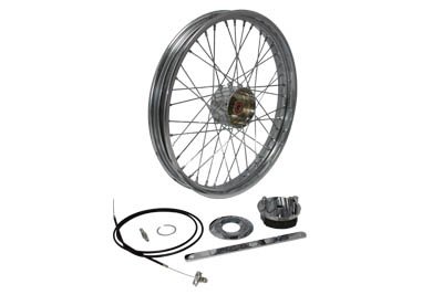 21" x 2.15" Chopper style wheel with a flat style rim, 3-1/2" wide hub, 40 chrome spokes. Brake cable and anchor bar are included. Wheel has a 5/8" and is a drum brake design This spool wheel is laced and trued with 3/4" heavy duty bearings installed. Fits 1973 & later models with 3/4" axles. Wyatt Gatling & Paughco custom springers require axle kit, 3/4" inner diameter spacers and backing plate stay bar, sold separately. NOTE: All spokes on wheel need to be inspected and re-torqued after 500 miles of original installation. Fits:Custom application UOM: 1 - EA Location: Front 2011 Catalog pages: 1167 Suggested to use brake lever #23-0588 Suggested to use with #23-3081 shoes Suggested to use #44-2016 axle kit Suggested to use with #52-0589 backing plate stay bar 23-0589 - Backing Plate Stay Bar 36-0612 - Brake Cable 74-1/2" 23-0589 - Backing Plate Stay Bar 36-0612 - Brake Cable 74-1/2" SAV for Harley Davidson Motorcycles